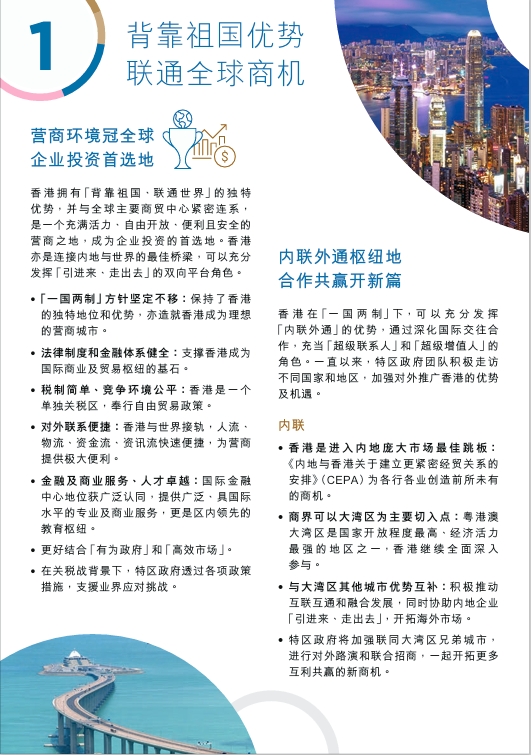 香港特区政府近日发布《香港营商环境报告:一国两制 独特优势》。报告向社会各界和海内外投资者详细介绍香港的最新发展和优势,全方位说明香港开放、安全、稳定、高效和国际化的营商环境。